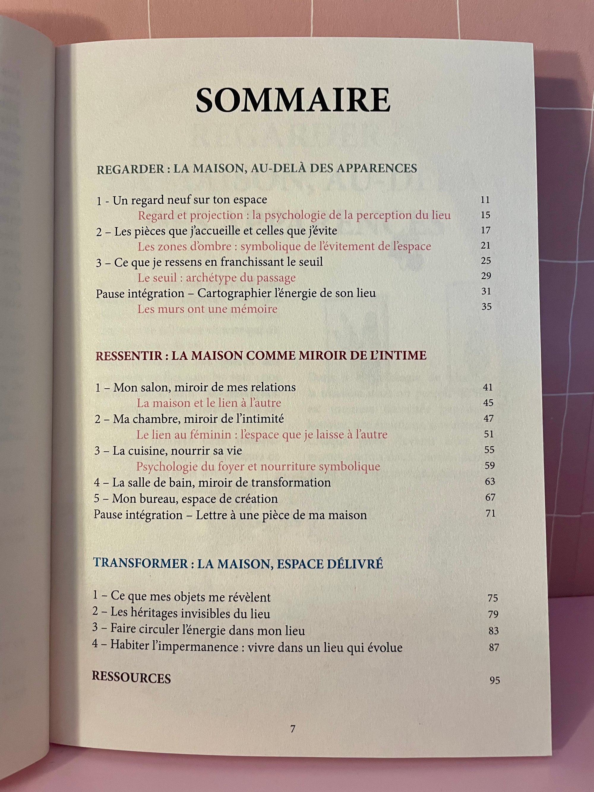 Des pages d’éclairages, imprimées sur papier rose, issues de la psychologie de l’habitat, de la psychanalyse et des sciences humaines. Ces textes viennent approfondir certaines explorations et offrent des clés pour comprendre pourquoi notre manière d’habiter un lieu parle aussi de notre monde intérieur.